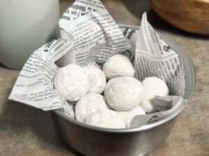 アメリカらしく少し甘めで、華やかな印象を与えます。粉砂糖をたっぷりまぶすため、見た目も雪玉らしさが強調されます。さらに、ホリデーシーズンにはカラフルな缶や袋に詰めて配る習慣があり、家庭で親子が一緒に作るお菓子としても親しまれています。