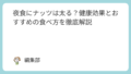 - バナナ:自然な甘さが満足感を与え、消化にも優しい夜食向けフルーツです。ビタミンB群やカリウムも含まれているため、疲労回復やむくみ予防にも役立ちます。冷凍バナナをスムージーにすればアイス感覚で楽しめ、満足度が高まります。